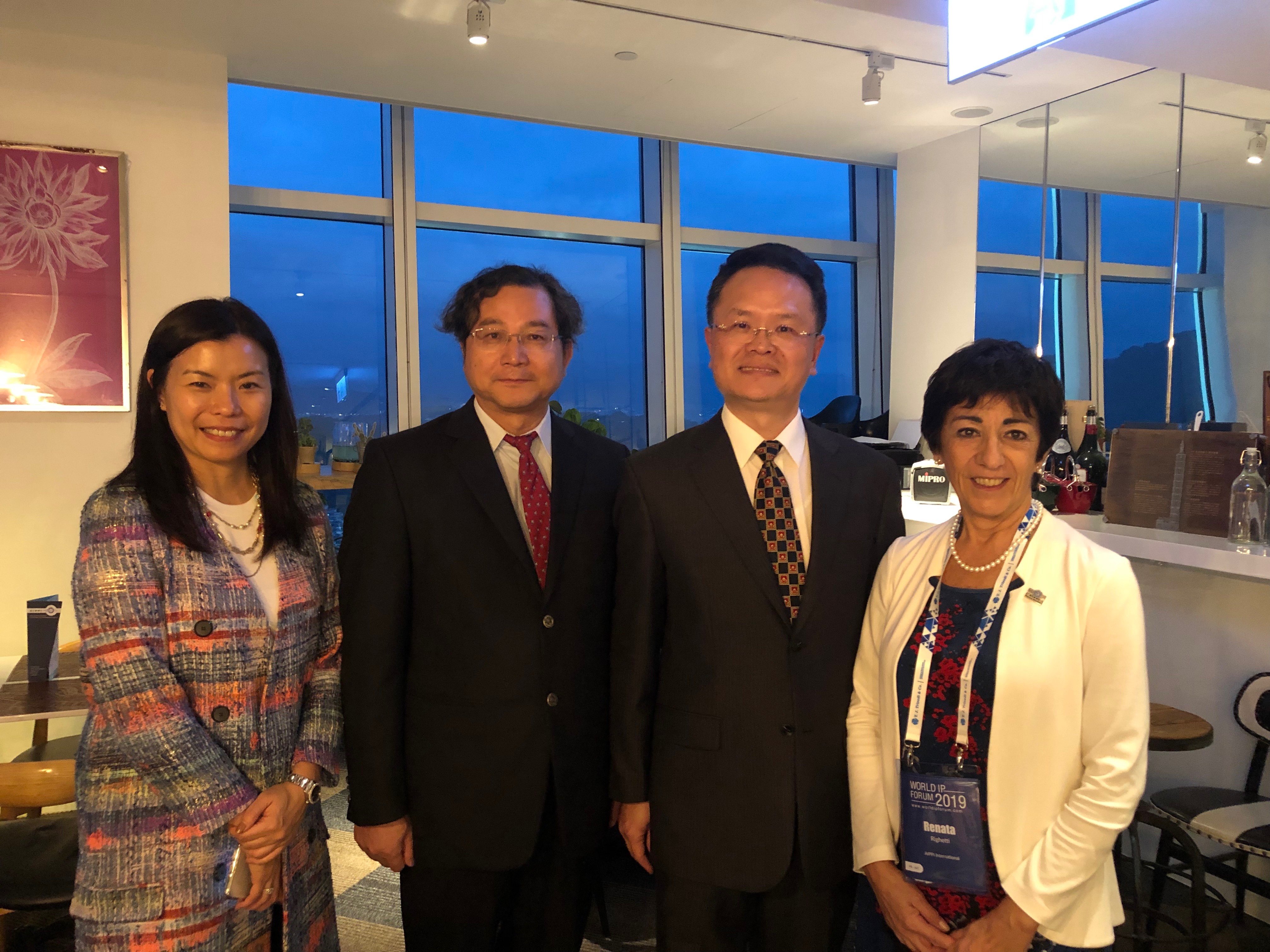 AIPPI首席副秘書長Annie Tsai (香港)、蔡坤旺所長、智慧局廖副局長、AIPPI會長Ranata Righetti (義大利)合影。(由左至右)